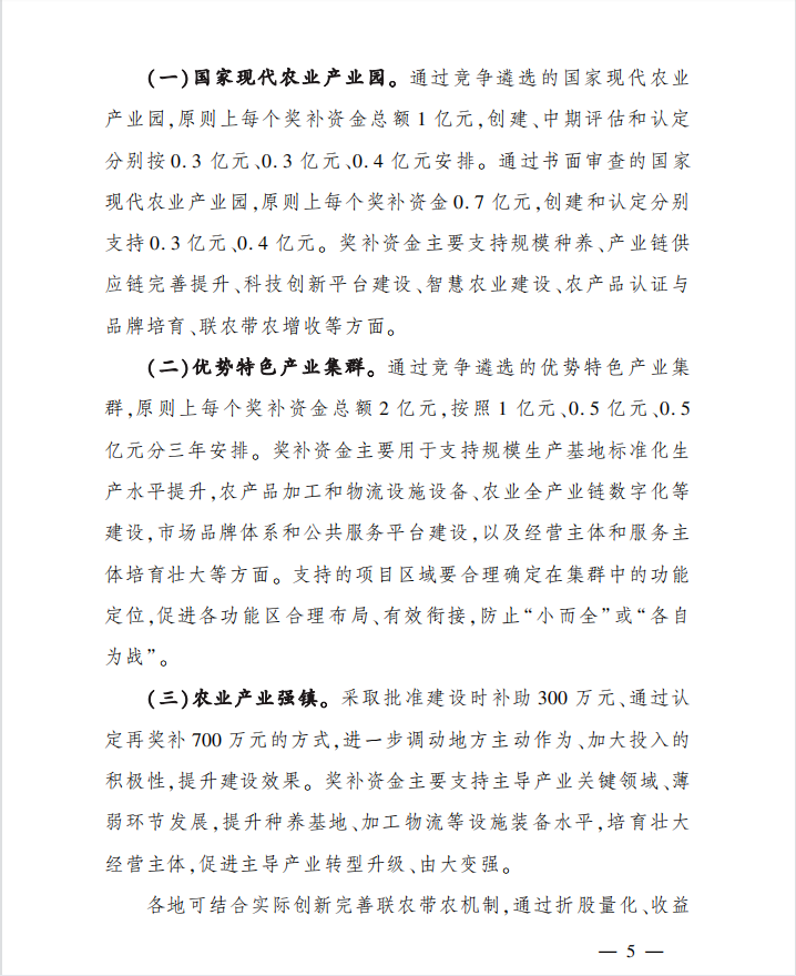 1.國家現代農業產業園:原則上每個獎補資金總額1億元。