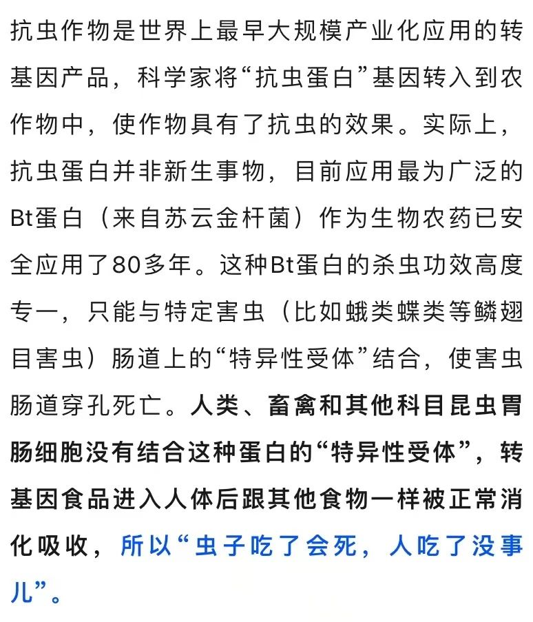 對害蟲起作用的抗蟲蛋白,進入人的消化道后不會對人發(fā)揮作用。抗蟲蛋白對我們來說就跟牛奶中的蛋白質(zhì)、豬肉中的蛋白質(zhì)、植物中的蛋白質(zhì)一樣被人體消化降解,不會對我們造成傷害,所以人吃了轉(zhuǎn)基因抗蟲作物不會有事。