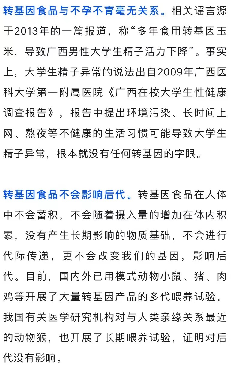 答:至于傳說中的轉(zhuǎn)基因食品會致癌、引起不孕不育、影響后代等,都是謠言。有關(guān)部門和專家用科學試驗和生產(chǎn)實踐的大量數(shù)據(jù)事實多次予以澄清,但在互聯(lián)網(wǎng)上仍然反復出現(xiàn),誤導了不少人,這些謠言中,有的是道聽途說,有的則是別有用心。