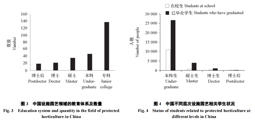 21世紀以前,中國設施園藝人才培養主要依賴園藝類專業,建國初期15所農業院校建有果樹蔬菜專業,1952年發展為28所農業高校設有果樹蔬菜專業,1957年果樹蔬菜專業改為果樹專業和蔬菜專業;1956年個別院校開始招收果樹和蔬菜研究生;1977年恢復高考后,不僅果樹專業和蔬菜專業得到快速發展,而且拓展了觀賞園藝專業;1998年果樹、蔬菜和觀賞園藝3個專業合并為園藝專業。1981年全國設立了1個果樹學博士學位授權點,2個蔬菜學博士學位授權點;目前全國70多所院校設有園藝專業,36所院校設有碩士點,21所院校設有博士點。在園藝人才培養中,北方許多院校開設了《蔬菜保護地栽培》和《設施園藝學》課程;1961年北京農業大學(現中國農業大學)主編出版了首部高等農業院校試用教材《蔬菜栽培學下冊——保護地栽培》;1978年仍由北京農業大學主編出版了全國高等農業院校統編教材《蔬菜栽培學——保護地栽培》;2001年主編出版了中國首部《設施園藝學》統編教材;而后又出版了《無土栽培學》教材等。