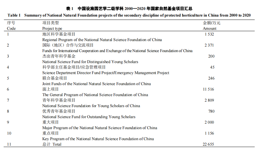 “十五”至“十二五”期間,科技部在設施園藝方面不僅設立了科技支撐計劃項目,還設立了“863”項目和“973”項目。“十三五”期間,科技部設立了設施園藝減肥減藥、設施果實類蔬菜高產生理基礎、設施生產關鍵技術、蔬菜優質輕簡高效生產技術等項目。此外,這一期間設施園藝領域的國家自然科學基金項目也不斷增加。據不完全統計,近20年,科技部立項資助科技項目(包括“863”、“973”、國家科技攻關計劃、國家科技支撐計劃、農業科技成果轉化資金支持、國家星火計劃、科技基礎工作專項、國家科技推廣、國家重點研發計劃等)總經費近4億元;國家自然科學基金委員會立項資助科技項目總經費2.2655億元(表1);農業農村部立項資助科技項目(包括公益性行業科研專項、轉基因重大專項、現代農業產業技術體系崗位科學家專項、現代農業產業技術體系試驗站站長專項、“948”計劃、農業部跨越計劃等)總經費約2.8億元;各省市自治區立項資助科技項目總經費超3.7億元。這些項目為中國設施園藝產業發展提供了重要科技支撐。