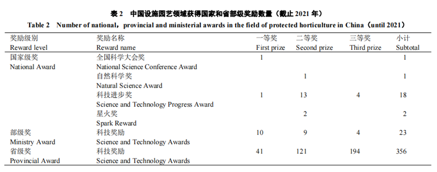 獲得省部級以上獎勵的科技成果:截至2021年,設施園藝領域獲得國家級獎勵22項,其中全國科學大會獎1項,國家自然科學獎二等獎1項,國家科技進步獎一等獎1項、二等獎13項、三等獎4項。獲得部級各類科技獎勵23項,其中一等獎10項、二等獎9項、三等獎4項。獲得省級各類科技獎勵356項,其中一等獎41項、二等獎121項、三等獎194項(表2)。這些獎勵成果創造了巨大的經濟、社會和生態效益。