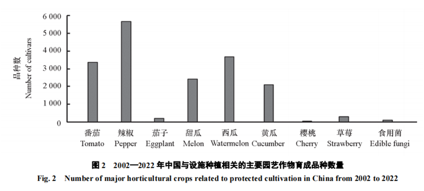 育成的設施專用品種:21世紀以前,極少有中國自主育成的設施專用園藝作物品種。進入21世紀之后,已經育成一批設施專用園藝作物品種。2002年至今,中國與設施種植相關的主要園藝作物育成品種(不區分露地/設施)大體為:番茄3363個、辣椒5661個、茄子194個、甜瓜2426個、西瓜3675個、黃瓜2085個、櫻桃41個、草莓292個、食用菌109個(圖2)。