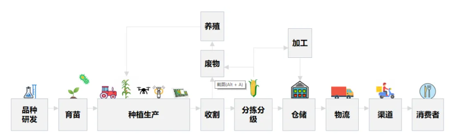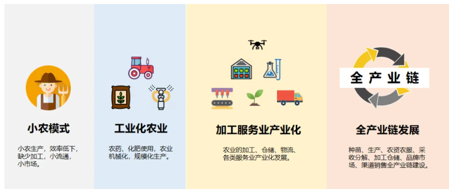 全產業鏈是中糧集團提出來的一種發展模式,是在中國居民食品消費升級、農產品產業升級、食品安全形勢嚴峻的大背景下應運而生的。農業產業鏈研究最初圍繞生產環節展開,關注農業生產與技術研發;隨著市場經濟的發展,逐步以 “統購統銷”等形式向市場端延伸;隨著工業化、城市化進程加快,農業產業鏈繼續朝著科研、生產、加工、銷售一體化方向拓展,通過鏈條的完善來實現專業化、規模化;與此同時,配方施肥、水肥一體化等綠色生產技術構成了農業綠色發展的模式。通俗點說,就是從種子/種苗->種植生產->加工->渠道->餐桌這樣一個從頭到尾的鏈條。