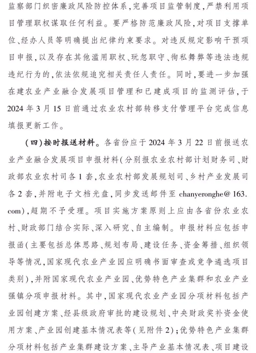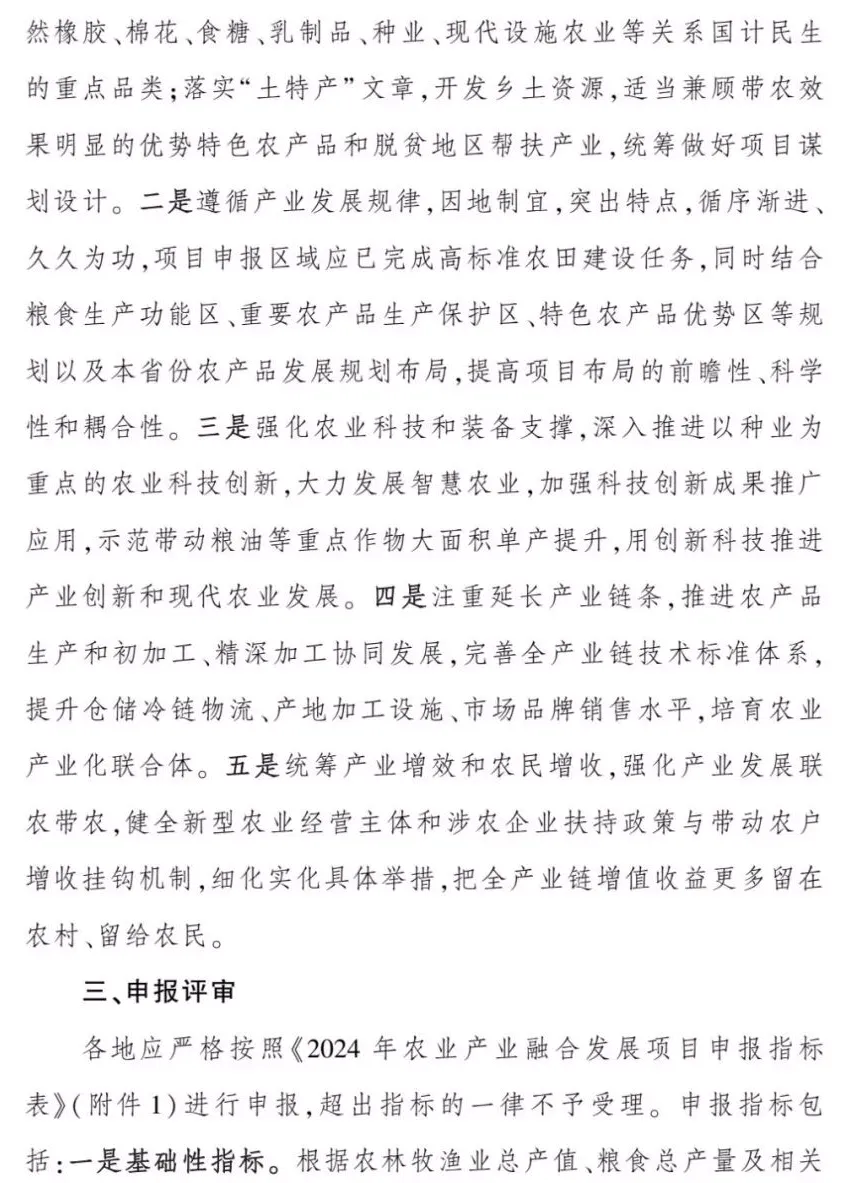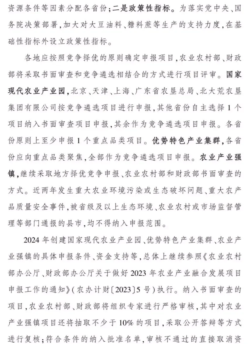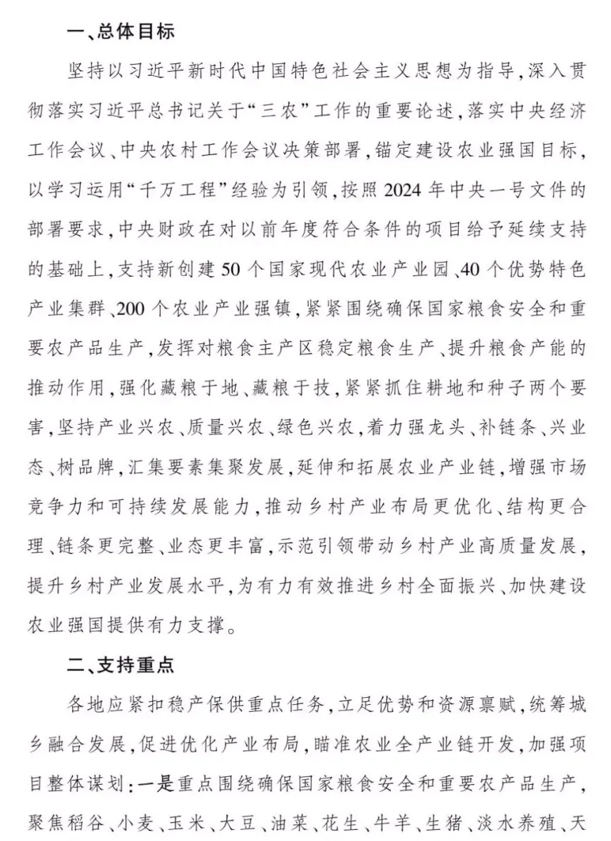按照2024年中央一號(hào)文件的部署要求,中央財(cái)政在對(duì)以前年度符合條件的項(xiàng)目給予延續(xù)支持的基礎(chǔ)上,支持新創(chuàng)建50個(gè)國(guó)家現(xiàn)代農(nóng)業(yè)產(chǎn)業(yè)園、40 個(gè)優(yōu)勢(shì)特色產(chǎn)業(yè)集群、200個(gè)農(nóng)業(yè)產(chǎn)業(yè)強(qiáng)鎮(zhèn),緊緊圍繞確保國(guó)家糧食安全和重要農(nóng)產(chǎn)品生產(chǎn),發(fā)揮對(duì)糧食主產(chǎn)區(qū)穩(wěn)定糧食生產(chǎn)、提升糧食產(chǎn)能的推動(dòng)作用,強(qiáng)化藏糧于地、藏糧于技,緊緊抓住耕地和種子兩個(gè)要害,堅(jiān)持產(chǎn)業(yè)興農(nóng)、質(zhì)量興農(nóng)、綠色興農(nóng),著力強(qiáng)龍頭、補(bǔ)鏈條、興業(yè)態(tài)、樹(shù)品牌,匯集要素集聚發(fā)展,延伸和拓展農(nóng)業(yè)產(chǎn)業(yè)鏈,增強(qiáng)市場(chǎng)競(jìng)爭(zhēng)力和可持續(xù)發(fā)展能力,推動(dòng)鄉(xiāng)村產(chǎn)業(yè)布局更優(yōu)化、結(jié)構(gòu)更合理、鏈條更完整、業(yè)態(tài)更豐富,示范引領(lǐng)帶動(dòng)鄉(xiāng)村產(chǎn)業(yè)高質(zhì)量發(fā)展提升鄉(xiāng)村產(chǎn)業(yè)發(fā)展水平,為有力有效推進(jìn)鄉(xiāng)村全面振興、加快建設(shè)農(nóng)業(yè)強(qiáng)國(guó)提供有力支撐。
