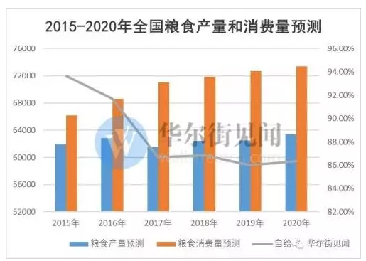 但出現了一個尷尬的狀況:糧食的自給率在下降。從統計局對“十三五”期間的糧食產量和消費量的預測來看: