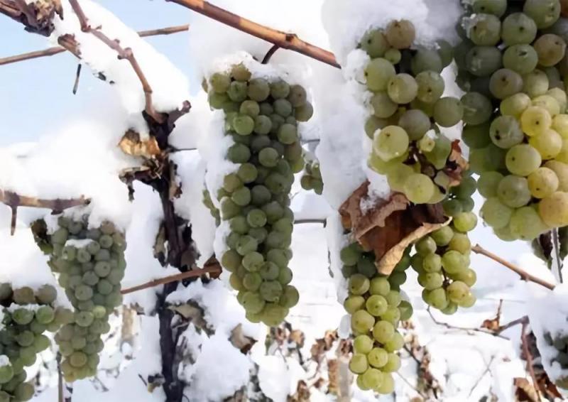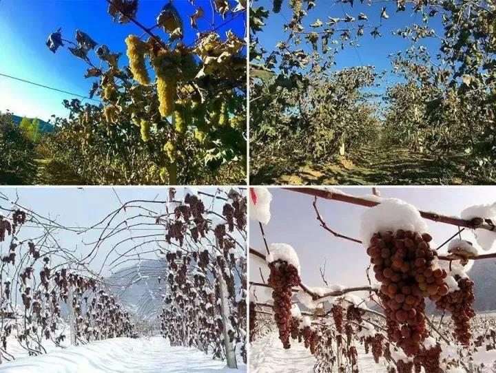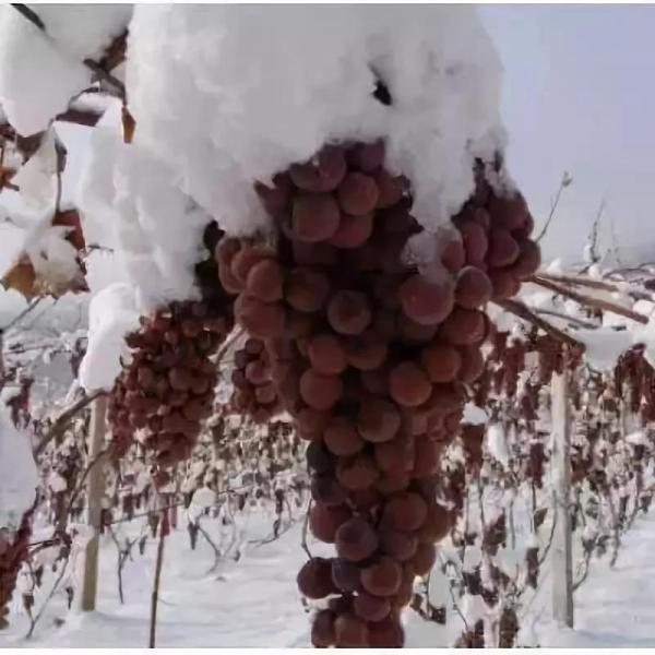 “冰葡萄學名威代爾,它對地理及氣候條件的要求非常苛刻:春、夏、秋三季氣溫要足夠溫暖滿足生長需求,而冬季要足夠寒冷,全世界只有德國、法國、加拿大、奧地利和中國等少數幾個國家的特定地點能生產。9月末成熟后,冰葡萄就一直掛在枝頭,進入嚴冬后反復經霜凍消融,水分越來越少,糖度不斷提高。顏色也從綠變成這種深棕色。當氣溫達到零下8攝氏度以下,并且持續24小時后,冰葡萄才能采摘。”