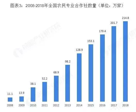 在政策大力推動下,全國農(nóng)民專業(yè)合作社數(shù)量大幅飆升。截至2018年底,全國在工商部門注冊登記的農(nóng)民專業(yè)合作社數(shù)量已達(dá)到214.8萬家,較2017年底增長6.5%。