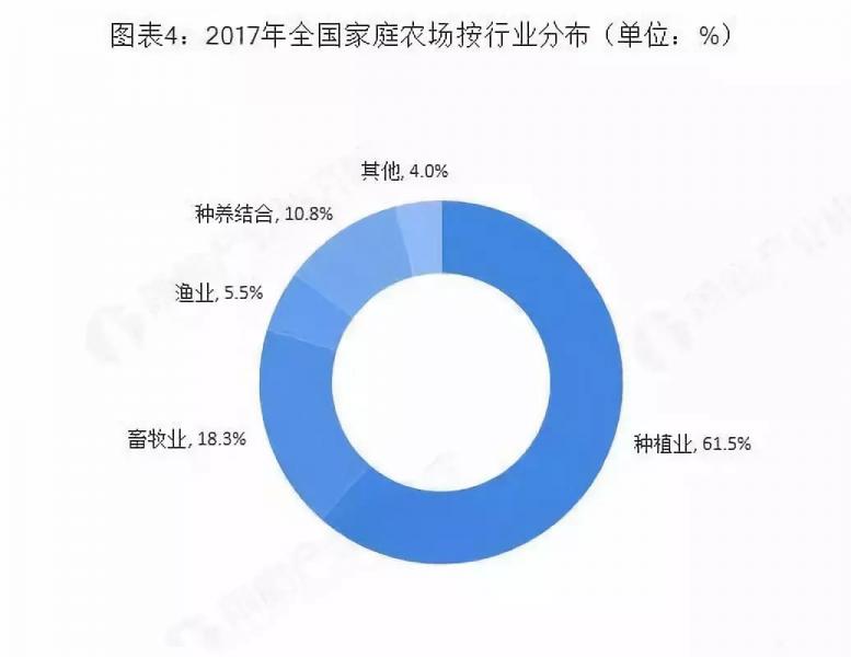 根據(jù)《農(nóng)村經(jīng)營管理》雜志調(diào)查,截至2017年底,全國家庭農(nóng)場累計達(dá)54.9萬個,比2016年底增加10.4萬個,增長23.3%。其中,從事種植業(yè)的家庭農(nóng)場33.7萬個,占家庭農(nóng)場總數(shù)的61.5%;從事畜牧業(yè)的家庭農(nóng)場10.1萬個,占家庭農(nóng)場總數(shù)的18.3%;從事漁業(yè)、種養(yǎng)結(jié)合、其他類型的家庭農(nóng)場分別為3.0萬個、5.9萬個、2.2萬個,分別占家庭農(nóng)場總數(shù)的5.5%、10.8%、4.0%。