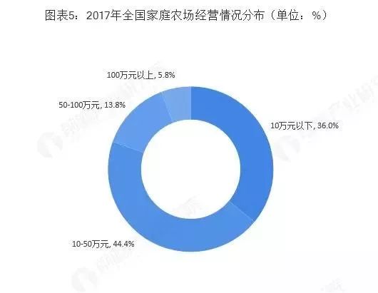 經(jīng)營情況來看,2017年,各類家庭農(nóng)場年銷售農(nóng)產(chǎn)品總值1765.5億元,平均每個家庭農(nóng)場32.2萬元。其中,年銷售總值在10萬元以下的家庭農(nóng)場19.8萬個,占家庭農(nóng)場總數(shù)的36.0%;10萬-50萬元的占44.4%,50萬-100萬元的占13.8%、100萬元以上的占5.8%。