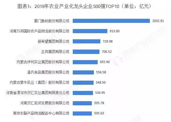 其中,廈門象嶼股分有限公司、河南萬邦國際農(nóng)產(chǎn)品物流股份有限公司、新希望集團(tuán)有限公司、正邦集團(tuán)有限公司、內(nèi)蒙古伊利實業(yè)集團(tuán)股份有限公司、溫氏食品集團(tuán)股份有限公司、內(nèi)蒙古蒙牛乳業(yè)(集團(tuán))股份有限公司、河南省漯河市雙匯實業(yè)集團(tuán)有限責(zé)任公司、河南雙匯投資發(fā)畏股份有限公司以及南京農(nóng)副產(chǎn)品物流配送中心有限公司位列前十。