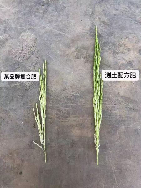 ▲施用禾大科技測土配方肥,株高1.25,分蘗17穗;施用傳統復合肥,株高1.15,分蘗11穗。