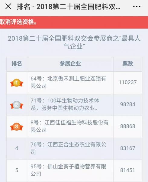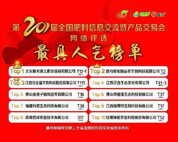 經(jīng)過緊張的投票評選和嚴格的審查復(fù)核,第二十屆全國肥料雙交會參展商“最具人氣企業(yè)”評選網(wǎng)絡(luò)投票結(jié)果新鮮出爐!!!
