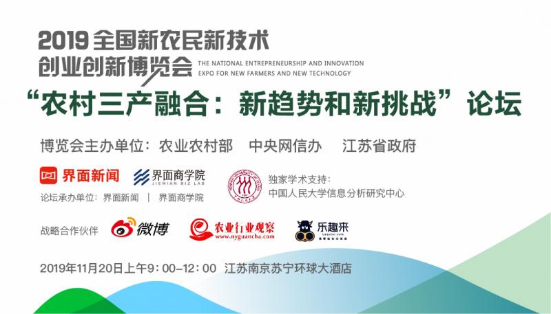 11月20日上午9時,界面新聞|界面商學院將在江蘇南京蘇寧環球大酒店舉辦“農村三產融合:新趨勢和新挑戰論壇”。本次論壇為2019年第三屆“全國新農民新技術創業創新博覽會”的分論壇之一,將邀請權威專家解讀農村一二三產業融合發展的戰略意義,政商學界代表討論農村一二三產業融合的評價體系、分配機制和政府角色,并發布2019年度農村一二三產業融合發展大數據分析報告,盤點各地產業融合的新業態、新模式和新趨勢。