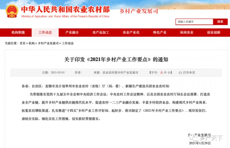 為貫徹落實黨的十九屆五中全會和中央經濟工作會議、中央農村工作會議精神,以及全國農業農村廳局長會議部署,打造農業全產業鏈,提升鄉村產業鏈供應鏈現代化水平,促進農村一二三產業融合發展,豐富鄉村經濟業態,構建現代鄉村產業體系,拓寬農民增收渠道,扎實推進“十四五”鄉村產業工作開好局、起好步,我司制定了《2021年鄉村產業工作要點》,現印發你們,請結合實際,細化實化工作措施,切實抓好貫徹落實。