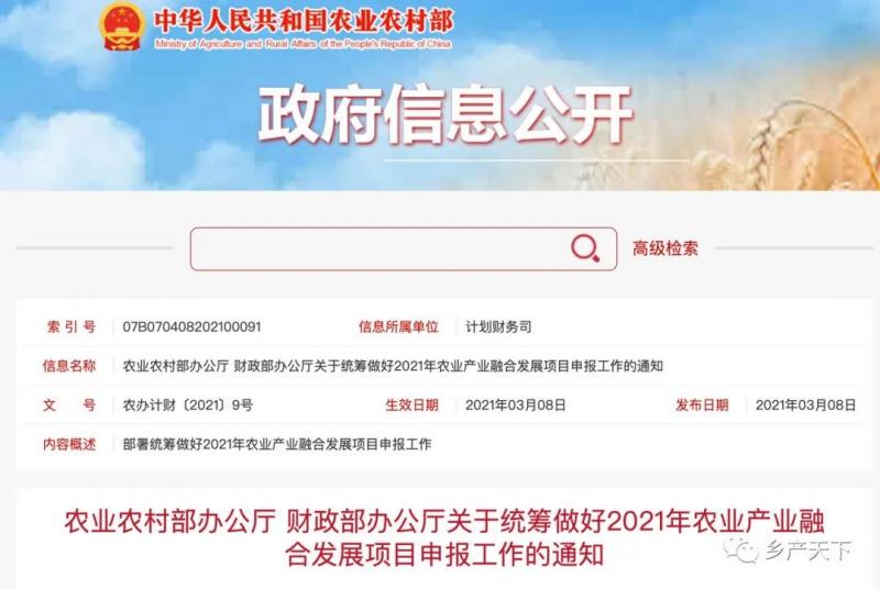 農業農村部辦公廳 財政部辦公廳關于統籌做好2021年農業產業融合發展項目申報工作的通知