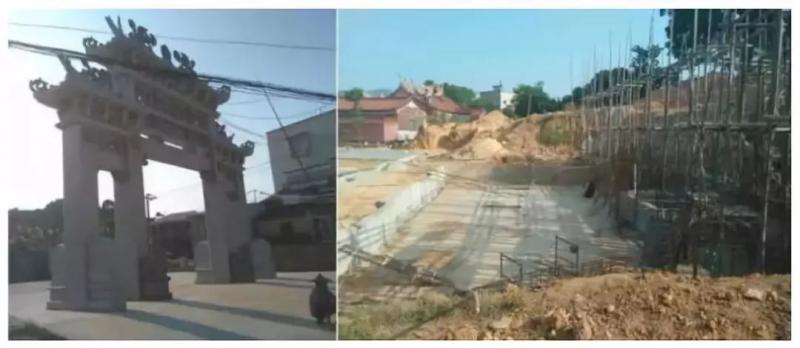 △龍海市**村建設大牌坊,在建水泥大水池、大假山
