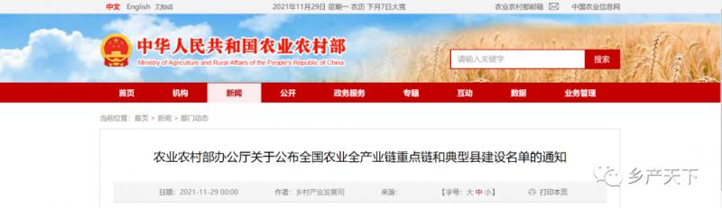 農(nóng)業(yè)農(nóng)村部辦公廳關(guān)于公布全國農(nóng)業(yè)全產(chǎn)業(yè)鏈重點鏈和典型縣建設(shè)名單的通知