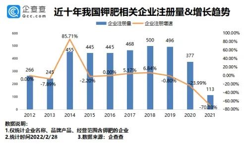 受俄羅斯和烏克蘭沖突影響,2022年中國、印度的鉀肥合同價格就達到了590美元/噸,同比上漲了343美元/噸,創下了10年以來的新高。企查查數據顯示,我國有鉀肥相關企業7257家,目前在業存續3949家。近5年來,我國鉀肥相關企業注冊量總體呈下降趨勢。2017年我國新增鉀肥相關企業468家,同比增長5.17%。2018年新增500家,同比增長6.84%。2019年新增496家,同比減少0.80%。2020年新增377家,同比減少23.99%。2021年我國新增113家,同比減少70.03%。