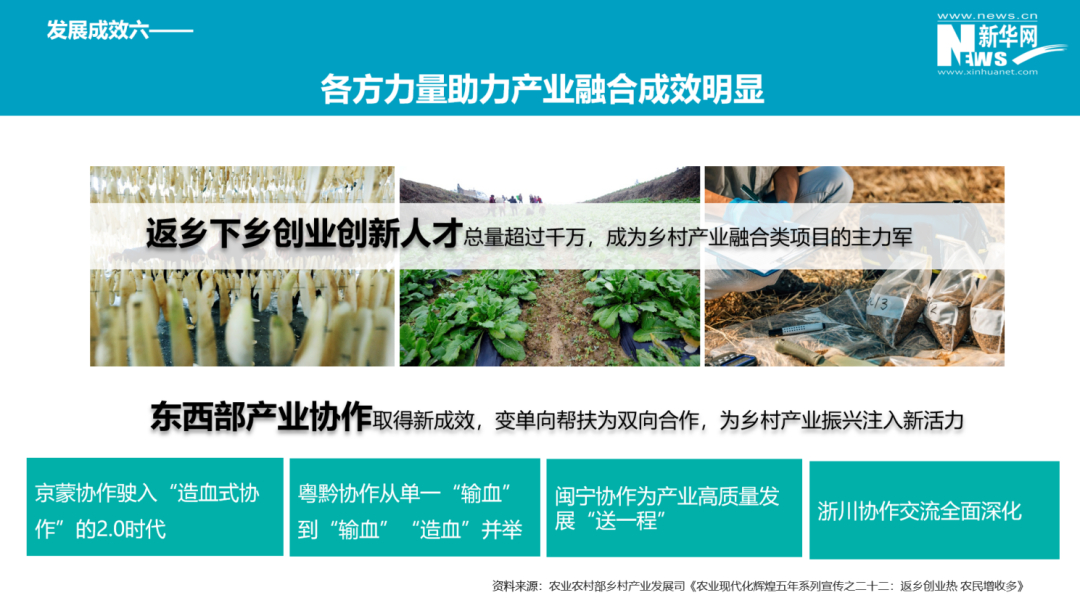 (六)各方力量助力產(chǎn)業(yè)融合成效明顯。返鄉(xiāng)下鄉(xiāng)創(chuàng)業(yè)創(chuàng)新人才的總量已經(jīng)超過1000萬,成為鄉(xiāng)村產(chǎn)業(yè)融合類項目的主力軍;東西部產(chǎn)業(yè)協(xié)作均取得新成效,為鄉(xiāng)村產(chǎn)業(yè)振興注入新活力。