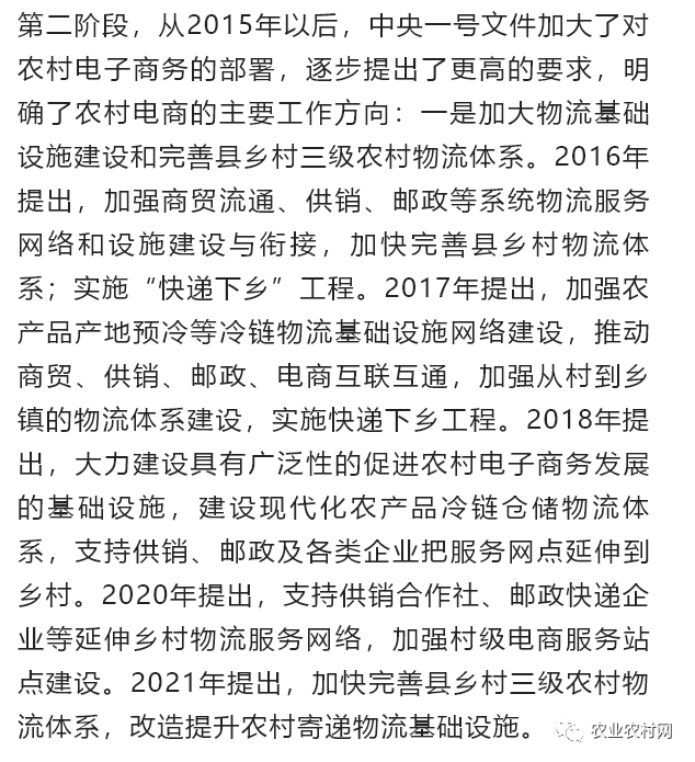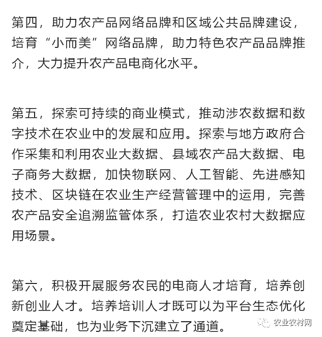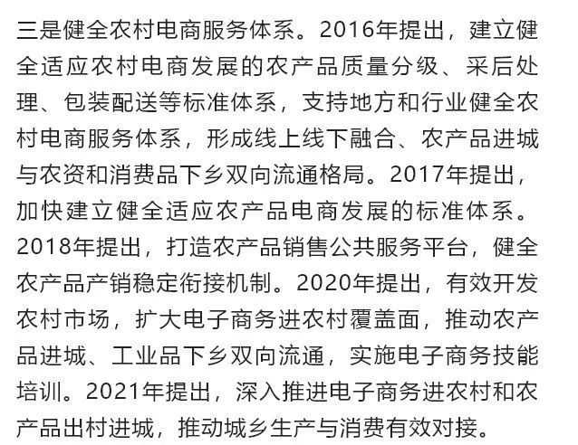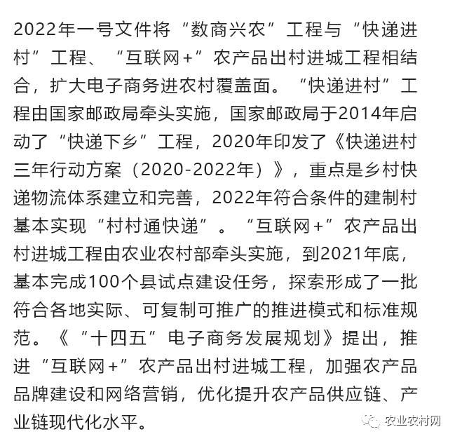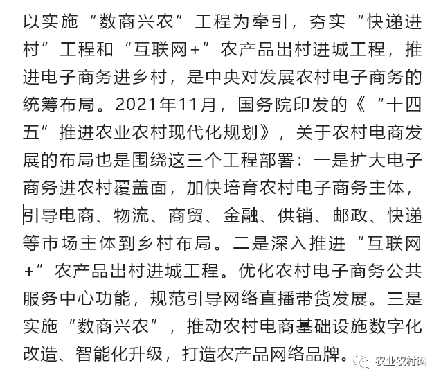 2021年10月,商務(wù)部、中央網(wǎng)信辦、發(fā)展改革委三部門聯(lián)合發(fā)布的《“十四五”電子商務(wù)發(fā)展規(guī)劃》明確指出,實(shí)施“數(shù)商興農(nóng)”行動(dòng)。包括:引導(dǎo)電子商務(wù)企業(yè)發(fā)展農(nóng)村電商新基建,提升農(nóng)產(chǎn)品物流配送、分揀加工等電子商務(wù)基礎(chǔ)設(shè)施數(shù)字化、網(wǎng)絡(luò)化、智能化水平,發(fā)展智慧供應(yīng)鏈,打通農(nóng)產(chǎn)品上行“最初一公里”和工業(yè)品下行“最后一公里”;培育農(nóng)產(chǎn)品網(wǎng)絡(luò)品牌,加強(qiáng)可電商化農(nóng)產(chǎn)品開(kāi)展“三品一標(biāo)”認(rèn)證和推廣,深入開(kāi)展農(nóng)產(chǎn)品網(wǎng)絡(luò)品牌創(chuàng)建,大力提升農(nóng)產(chǎn)品電商化水平。