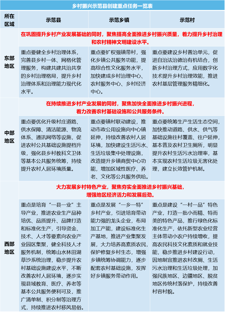 2022年,立足縣、鄉(xiāng)、村資源稟賦和發(fā)展基礎(chǔ),體現(xiàn)東、中、西部區(qū)域特色,農(nóng)業(yè)農(nóng)村部、國家鄉(xiāng)村振興局組織創(chuàng)建100個左右國家鄉(xiāng)村振興示范縣。根據(jù)所在地區(qū)發(fā)展程度不同,依托各地發(fā)展特點及工作重點,部署不同的創(chuàng)建任務(wù),其中重點任務(wù)如下。