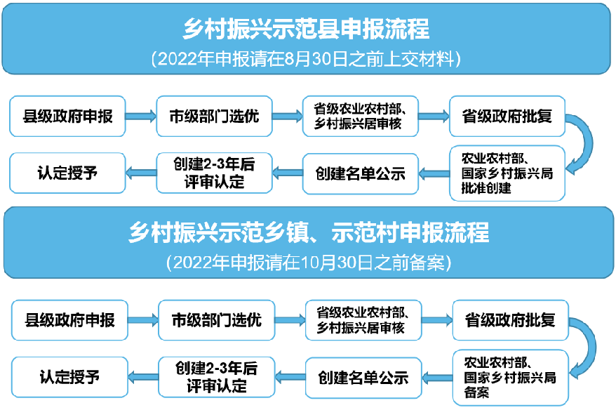 那么當(dāng)我們滿足了條件,該如何申報創(chuàng)建呢?下面我們來看看2022年鄉(xiāng)村振興示范縣的申報流程。