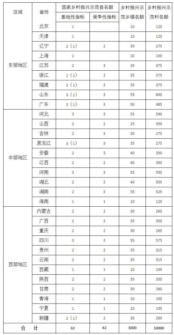2022年鄉(xiāng)村振興示范創(chuàng)建名額分配表