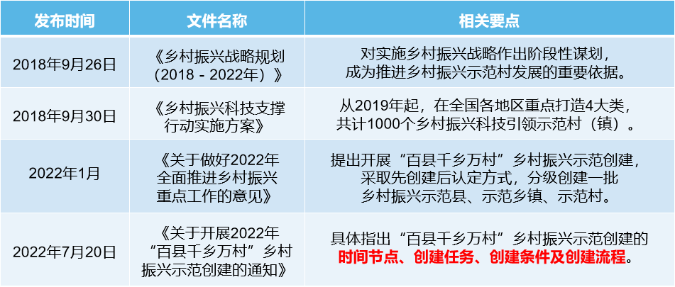 2022年1月,2022年中央一號文件正式發(fā)布,《關(guān)于做好2022年全面推進鄉(xiāng)村振興重點工作的意見》明確要開展“百縣千鄉(xiāng)萬村”鄉(xiāng)村振興示范創(chuàng)建,采取先創(chuàng)建后認定方式,分級創(chuàng)建一批鄉(xiāng)村振興示范縣、示范鄉(xiāng)鎮(zhèn)、示范村。