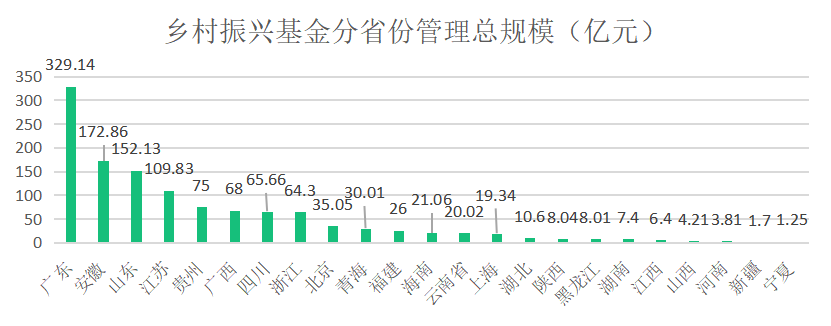 按照省份統計,有23個省份設立了鄉村振興基金。除央企農村投資基金外,設立鄉村振興基金規模前五名的省份分別是廣東、安徽、山東、江蘇、貴州。其中,安徽、山東、江西的鄉村振興基金總管理規模已超過百億,廣東的鄉村振興基金總管理規模更是已經超過了300億。