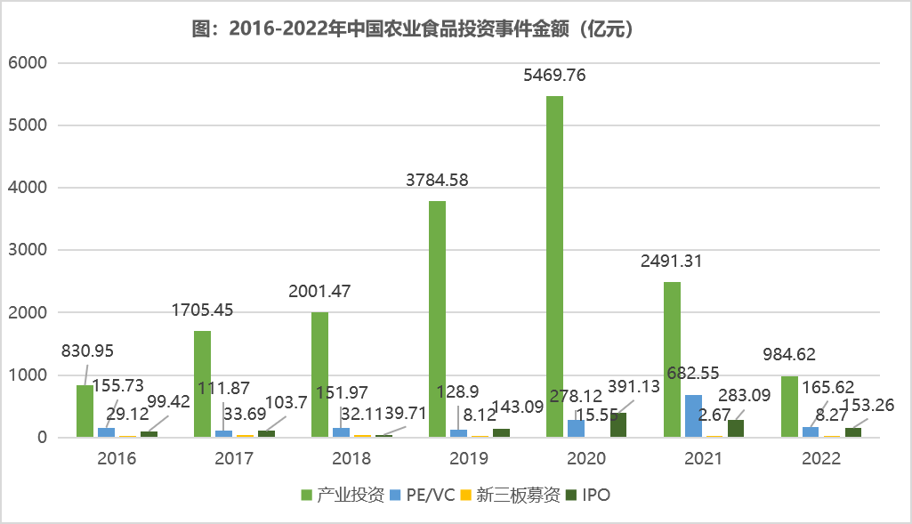 據艾格農業即將發布的《2022中國農業食品投資年報》數據顯示,2016年-2022年,農業食品領域的投資事件數量共約5660起,募集資金共約2.03萬億。其中,2022年各類投資事件數量共約874起,募集資金1300多億。