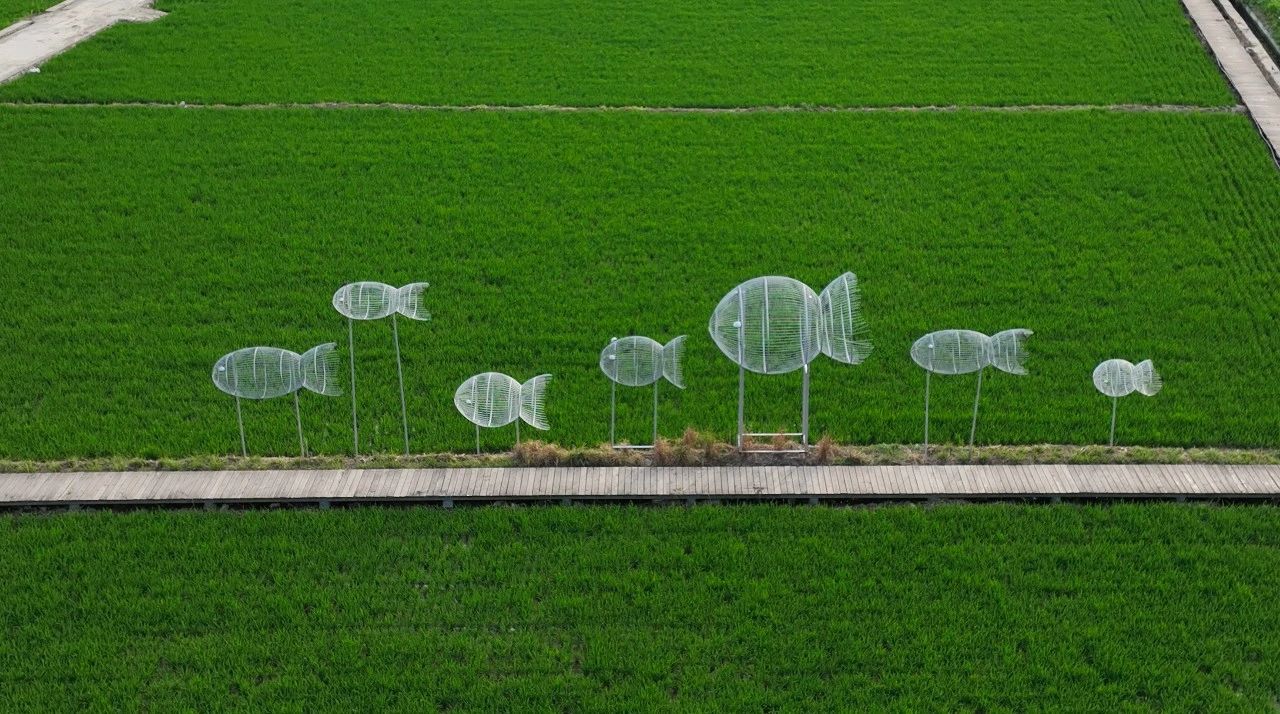 農(nóng)田的田埂建起了參觀廊道,引入了一些藝術(shù)家的設(shè)計作品