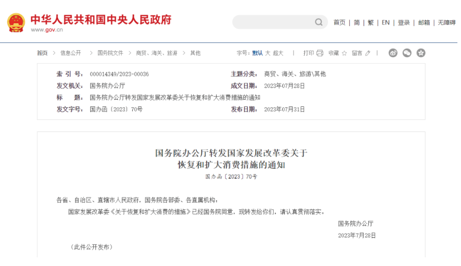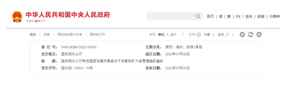 【發(fā)文機關(guān)】國務(wù)院辦公廳【發(fā)文字號】國辦函〔2023〕70號【發(fā)布時間】2023.7.31