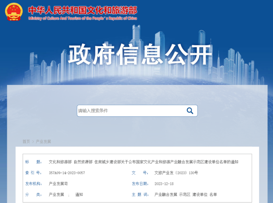 《關(guān)于公布國家文化產(chǎn)業(yè)和旅游產(chǎn)業(yè)融合發(fā)展示范區(qū)建設(shè)單位名單的通知》