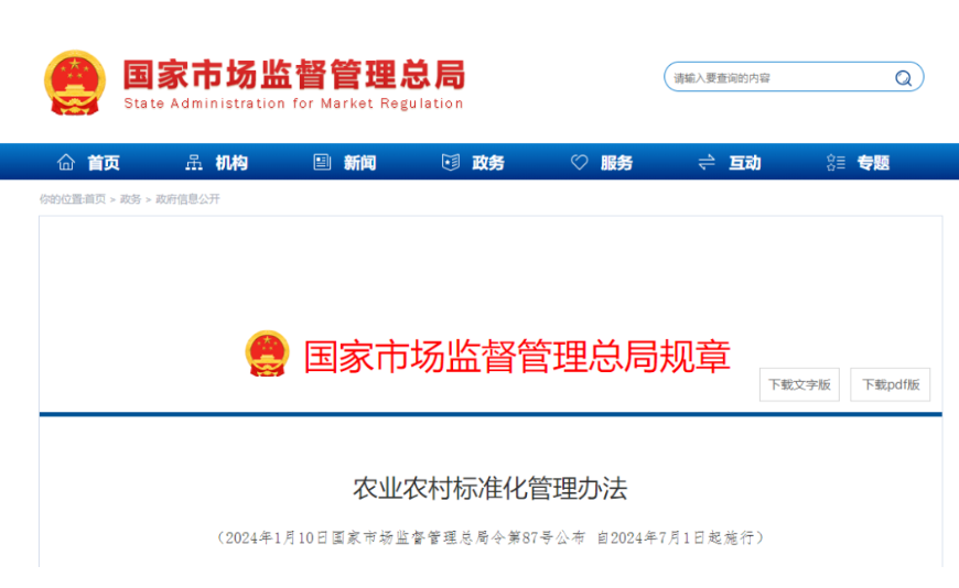 【主要內(nèi)容】本次修訂的主要內(nèi)容和亮點包括:一是將規(guī)章適用范圍從單一的農(nóng)業(yè)拓展到農(nóng)業(yè)農(nóng)村領(lǐng)域,對農(nóng)業(yè)農(nóng)村標準的定義和范圍進行界定,將農(nóng)村設(shè)施環(huán)境、農(nóng)村公共服務(wù)、鄉(xiāng)村治理等技術(shù)要求納入農(nóng)業(yè)農(nóng)村標準化工作。二是明確農(nóng)業(yè)農(nóng)村標準制定要求,將其聚焦于解決農(nóng)業(yè)農(nóng)村領(lǐng)域突出共性問題、提高農(nóng)產(chǎn)品質(zhì)量和效率、提升鄉(xiāng)村治理能力、保護生態(tài)環(huán)境等。三是明確農(nóng)業(yè)農(nóng)村國家標準、地方標準范圍,規(guī)定農(nóng)業(yè)投入品及一般性農(nóng)產(chǎn)品質(zhì)量、檢測方法原則上不制定地方標準;鼓勵社會團體根據(jù)市場需求和創(chuàng)新發(fā)展需要,制定團體標準。四是突出標準實施手段的創(chuàng)新,規(guī)定標準化行政主管部門會同有關(guān)行政部門采用信息化等手段,加強標準宣貫,因地制宜推動農(nóng)業(yè)農(nóng)村標準實施與應(yīng)用。(2024年7月1日起施行)