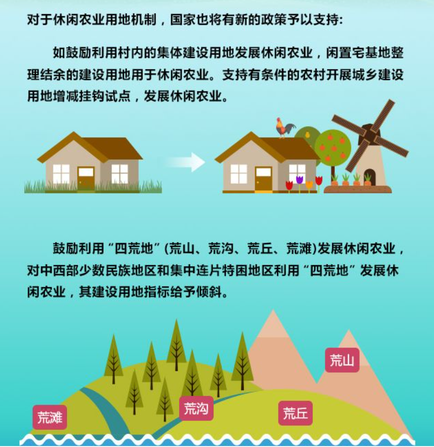 通知指出,將安排一定比例年度土地利用計劃,專項支持農(nóng)村新產(chǎn)業(yè)新業(yè)態(tài)和產(chǎn)業(yè)融合發(fā)展。對存量建設用地用于小微創(chuàng)業(yè)園、休閑農(nóng)業(yè)、鄉(xiāng)村旅游、農(nóng)村電商等農(nóng)村二三產(chǎn)業(yè)的市、縣,可給予新增建設用地計劃指標獎勵。