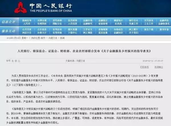 2019年2月11日,央行、銀保監會、證監會、財政部、農業農村部聯合發布《關于金融服務鄉村振興的指導意見》(以下簡稱《指導意見》)。