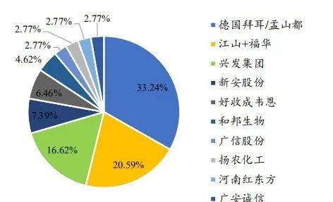 和邦生物、興發集團、江山股份、新安股份是當前國內主要的草甘膦生產企業,占據了國內一半以上的產能。