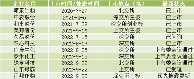 2022年8月19日,農心科技成功登陸深圳交易所;8月25日,廣康生化創業板IPO申請過會;30日-31日兩天時間,久易股份和泰禾化工接續成功闖關創業板;9月3日-4日接連兩天,正邦作物和山東綠霸分別沖刺深交所和上交所主板IPO;9月25日,綠亨科技沖擊北交所IPO成功。