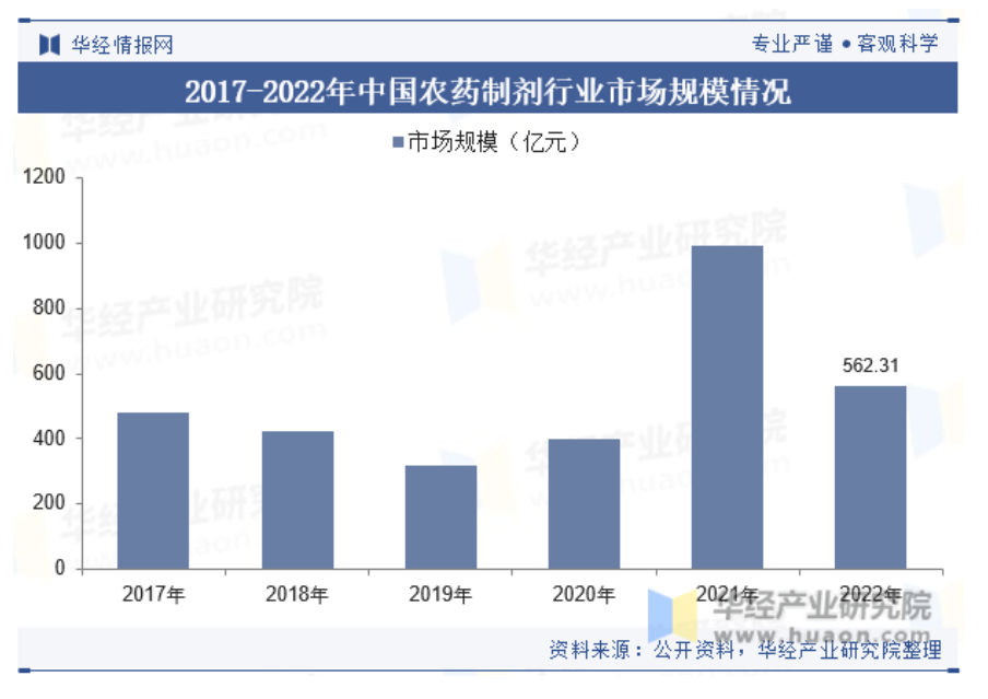 隨著中國農業的發展,農藥制劑行業市場規模不斷擴大,2022年我國農藥制劑行業市場規模為562.31億元。政府對農藥制劑行業的監管政策越來越嚴格,對環保和安全的要求也越來越高。這促使企業加大環保投入,加強安全管理,同時也限制了一些高毒、高殘留農藥制劑的使用。