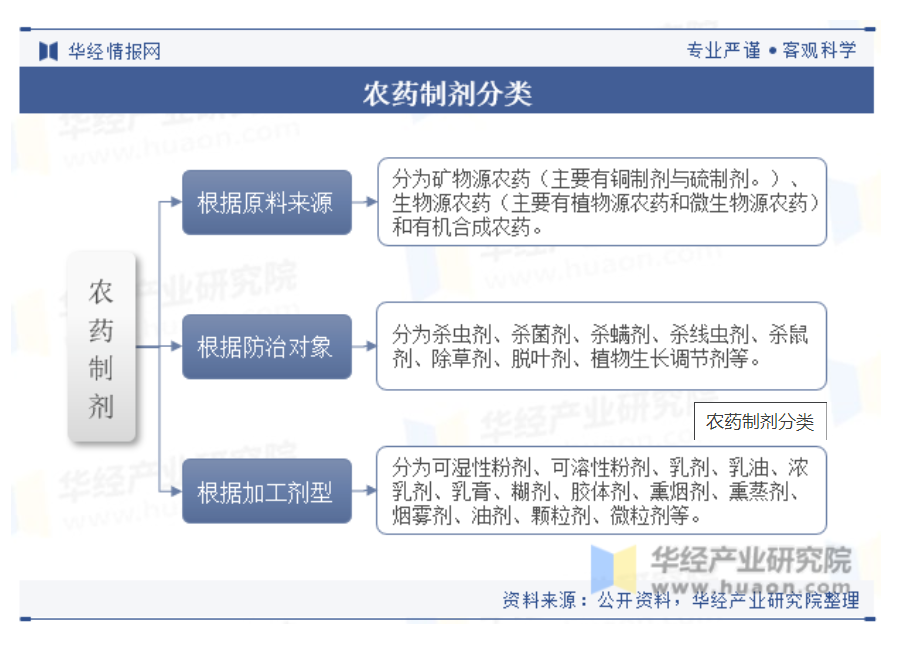 農藥制劑產品是指用于預防、控制危害農業、林業的病、蟲、草、鼠和其他有害生物以及有目的地調節植物、昆蟲生長的化學合成或者來源于生物、其他天然物質的一種物質或者幾種物質的混合物及其制劑。廣泛用于農業、林業、衛生等領域控制有害生物,為保障糧食安全、農產品質量安全、生態環境安全發揮重要作用。