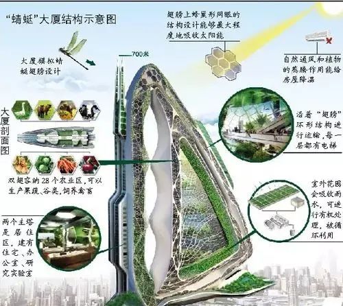 比利時建筑設計師文森特-卡爾博特根據蜻蜓的雙翼設計了一種所謂的“蜻蜓垂直農場”。這種設計方案或許可以解決紐約羅斯福島食品長途運輸的問題。在這棟132層的巨型建筑中,包括了28個不同的農業生產領域,可以供應水果、蔬菜、肉類、牛奶和魚類等各種農副產品。這棟建筑還包含有多個實驗區、辦公區和居住區等生活空間。