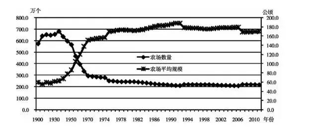 1. 第一階段 ( 1900—1935年) 。農場數量不斷增加, 農場數量從1900年的573. 7萬個增加至1935年681. 4萬個; 而農場規(guī)模保持基本穩(wěn)定, 農場平均經營規(guī)模在60公頃左右, 主要是由于土地面積快速增加, 而農場數量也在增加。