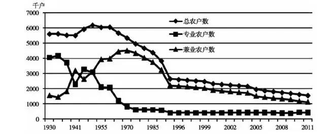 兼業(yè)農戶占有重要的地位。兼業(yè)農戶占總農戶的比重從1930年的27. 8% 增加到1975年的87. 6% , 之后緩慢減少。專業(yè)農戶比重從1930年的72. 2% 降至1975年的12. 4% , 之后進入緩慢增加的通道, 2011年兼業(yè)農戶和專業(yè)農戶分別占總農戶的71. 9% 和28. 1% 。
