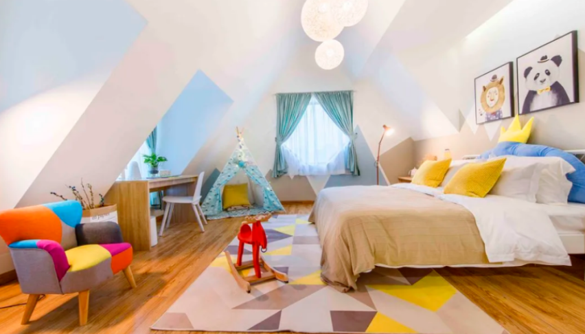 還有讓孩子們能盡情撒歡的親子客房,酒店有30間客房,城堡上下鋪、小房子造型床、攀爬架、小搖馬、小帳篷、滑梯等,每間房都有自己的特色,絕不刻意營造色彩斑斕的卡通環境,不會有高飽和度的紅黃藍刺激著視覺神經,就算紅也要紅的粉嫩。