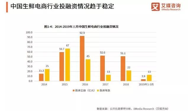 據(jù)艾媒報(bào)告《2019中國(guó)生鮮電商行業(yè)商業(yè)模式與用戶畫像分析報(bào)告》顯示,在今年的1-3月,生鮮電商企業(yè)已經(jīng)融資13筆,融資約3.9億人民幣。