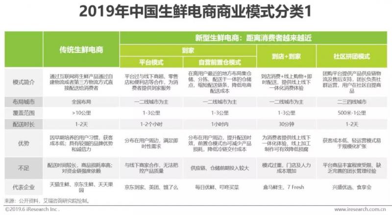 生鮮作為復購率高、市場空間大的品類,其龐大的市場規模吸引了眾多玩家投身其中,作為滲透率低、市場潛力巨大的生鮮電商行業競爭更為激烈,整體來看,行業處于春秋時期。現階段,在生鮮電商這條賽道上,除傳統生鮮電商外,前置倉、 “超市+餐飲”、社區拼團等創新模式不斷涌現,割據一方。從目前的格局來看,還沒有模式能夠真正“稱霸”生鮮電商市場,2019年生鮮電商多種商業模式并存的格局仍將繼續。