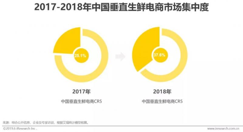 2018年中國垂直生鮮電商市場CR5占比37.6%,較上一年增加了12.5%,市場集中度快速提升,垂直生鮮電商市場已呈現出向頭部集聚的趨勢。