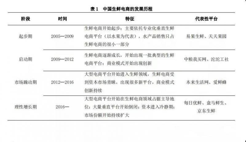 我國生鮮電商的發展始于2005年,其時商業模式已基本成熟,市場格局也已形成。2012年之前,生鮮電商主要以垂直專業電商平臺為主。自2012年起,各大綜合性電商平臺逐漸加入生鮮電商領域。2015-2016年,生鮮電商成為資本市場關注的熱點。但之后因大量垂直生鮮電商平臺紛紛倒閉,生鮮電商進入消沉期。近幾年綜合電商平臺強勢介入,生鮮電商已步入加速發展期,基本形成了“兩超——多強——小眾”的電商格局。“兩超”是指阿里系、京東系綜合性電商平臺的生鮮業務;“多強”是指具有較強競爭力的垂直生鮮電商,如每日優鮮、拼多多;“小眾”是指具有成長性的特色生鮮電商平臺。