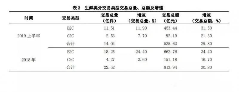 生鮮電商總體上還沒有全面滲透到居民生活之中。從數據上看,生鮮產品電子商務交易額總量逐年上升。2018年全國生鮮電商交易達到22.52億單,交易額達到814億元;2019年上半年,生鮮電商交易達到14.04億單,交易額達到535.63億元,增速達到29.8%,比整體電商增速高近10個百分點。